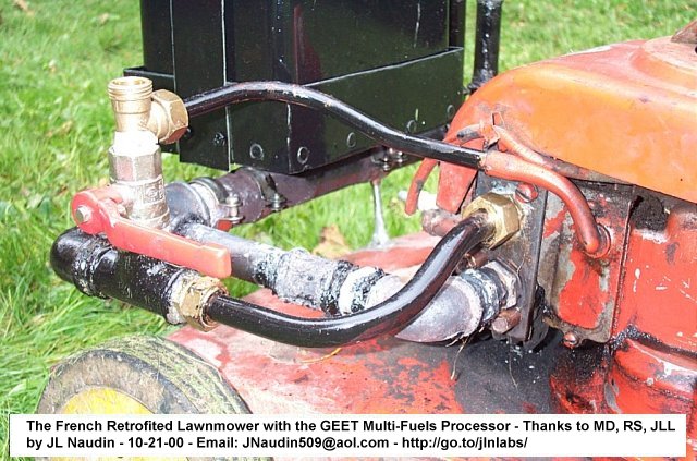 Commentaires additionels : La caractéristique la plus intéressante dans le Processeur Multi-Carburants de GEET est que ce système est capable d'utiliser n'importe quel type d'hydrocarbures comme des huiles usées, du méthanol, de l'essence, des solvants, du kérozène, du bio-diesel et le tout mélangé à de l'eau... Les essais viennent juste d'être commencés et des tests de performance seront conduits prochainement. Aujourd'hui, la seule chose que je peux dire, c'est que le Processeur Multi-Carburants de GEET fonctionne TRES BIEN sur ma propre tondeuse modifiée ( regardez les vidéos sur mon site ) et ce, en parfait accord avec le schéma publié par Pantone et ses observations :