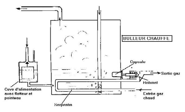 Le chauffage du bulleur est assuré par la circulation de gaz déchappement prélevés à la sortie du réacteur, et envoyés dans un serpentin de métal disposé au fond bulleur. La régulation du passage des gaz chauds dans le serpentin est contrôlée par une vanne thermostatique de radiateur de chauffage central.