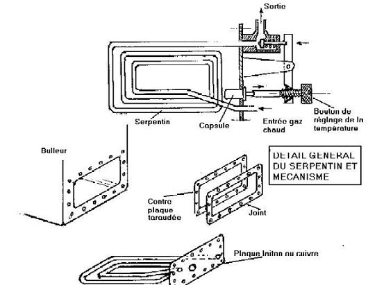 Si vous souhaitez pousser plus loin le perfectionnement de votre affaire vous pouvez envisager de chauffer à température constante lair assurant la vaporisation avant quil ne pénètre dans le bulleur. Vous pouvez facilement figer ce dernier paramètre assez instable. Fabriquez un autre petit échangeur avec un petit réservoir muni du même dispositif de serpentin et de vanne thermostatique que pour le bulleur, installez y un autre serpentin par lequel vous ferez circuler lair. Remplissez évidemment cet échangeur dun liquide quelconque avant la mise en route. Avec ce dispositif lair de volatilisation aura la température que vous souhaitez, après la montée en température de lensemble évidemment.
