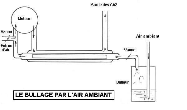 Avec le système du " bulleur " , au lieu de produire la volatilisation du carburant en forçant un peu de gaz déchappement à passer à travers celui-ci avec tous les inconvénients et avantages que je viens de décrire, on peut se contenter dutiliser lair ambiant pour assurer cette fonction.