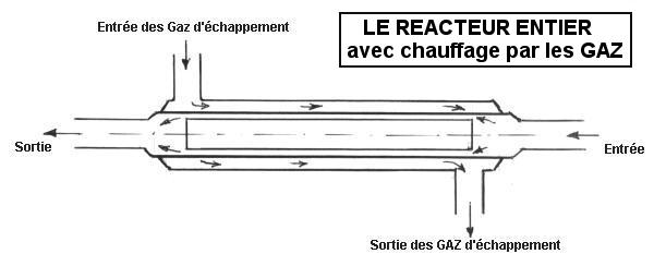 Je vous rappelle donc que le dispositif objet du brevet est composé dun tube de fer ordinaire à lintérieur duquel est fixée concentriquement une barre dacier dun diamètre suffisant pour quil ne reste quun espace de 1 à 2 millimètres environ entre cette tige et la paroi intérieure du tube. Pour que le fonctionnement du dispositif soit au top niveau, il convient de prévoir le chauffage de ce tube contenant le barreau dacier. Ce chauffage est donc obtenu en installant le tube appelé " tube réacteur " à lintérieur dun autre tube métallique et en y faisant circuler à contre courant les gaz déchappement du moteur.(voir dessin)