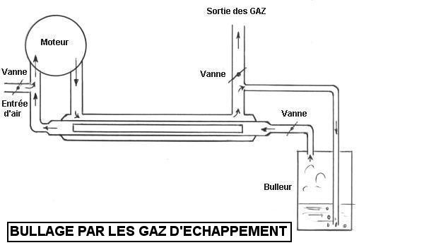 Dans le cas, où vous " bullez " avec les gaz déchappement, il faut bien comprendre que lon ne sait pas trop si les vapeurs sont plus poussées dans le réacteur quelles ne sont aspirées. On saperçoit avec lexpérience quon est obligé de maintenir le bulleur en légère surpression et quil faut réguler le débit de vapeur en direction du réacteur obligatoirement avec une vanne qui devient indispensable en plus de la vanne dadmission dair entre la sortie réacteur et lentrée moteur, puisque cest lajustement simultané de ces deux vannes qui produit le mélange correct pour le moteur. Cest bien compliqué et irréalisable de façon simple.