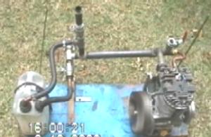 Cette solution simpliste, mais commode pour de premières expériences, présente plus dinconvénients que davantages. Ainsi, la chaleur du gaz déchappement, empêchera le carburant de se refroidir au point de ne sévaporer quavec difficulté ; cela semble un avantage, mais en réalité la température du bulleur sera complètement aléatoire, la vaporisation pouvant osciller entre linsuffisance et lexagération ce qui rend le contrôle du moteur délicat et possible seulement avec lajustement permanent des vannes. Par ce moyen, les bonnes proportions des composants du mélange explosif atteignant le moteur sont pratiquement impossibles à obtenir correctement sur toute la plage de vitesse du moteur. En conclusion si on tente dévaporer un carburant qui nest jamais à la même température avec un gaz qui est lui-même dans le même cas on a aucune chance dalimenter correctement le réacteur de façon linéaire à moins de passer son temps à manipuler les différentes vannes et sans savoir où on en est dans la qualité du mélange détonant.