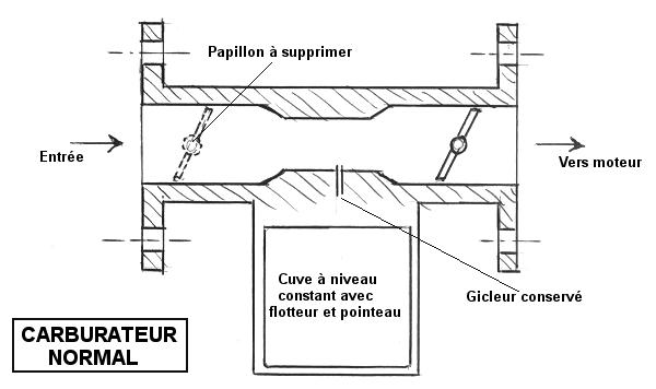 Après ce tour dhorizon sur ces deux systèmes de volatilisation, vous comprendrez que seul le deuxième peut permettre d'arriver à concevoir un montage simple où les paramètres les plus importants sont maîtrisés facilement et à faible coût, comme vous allez pouvoir vous en rendre compte par les descriptions qui vont suivre. Ce deuxième système permet de faire fonctionner le moteur très convenablement avec une seule vanne qui sera un carburateur classique légèrement modifié.