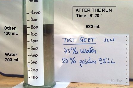 : Après 8'20" de fonctionnement à plein régime Sur les 1000 mL de mélange, il n'en reste que 830 mL. 120 mL d'essence et 50 mL d'eau ont été consommés. La consommation est de 20.4 mL / minute. |
