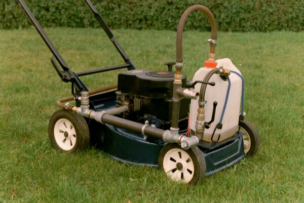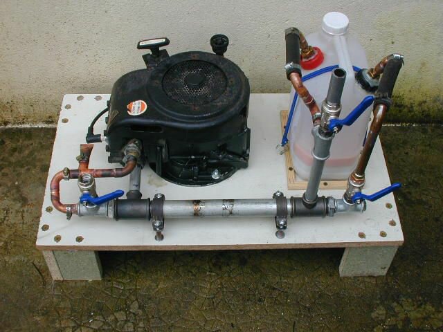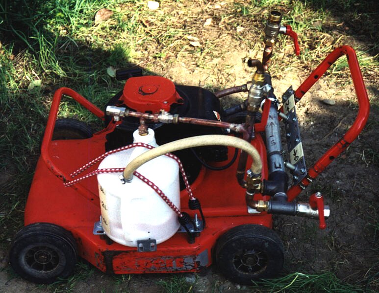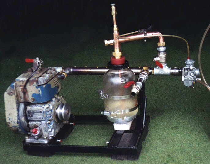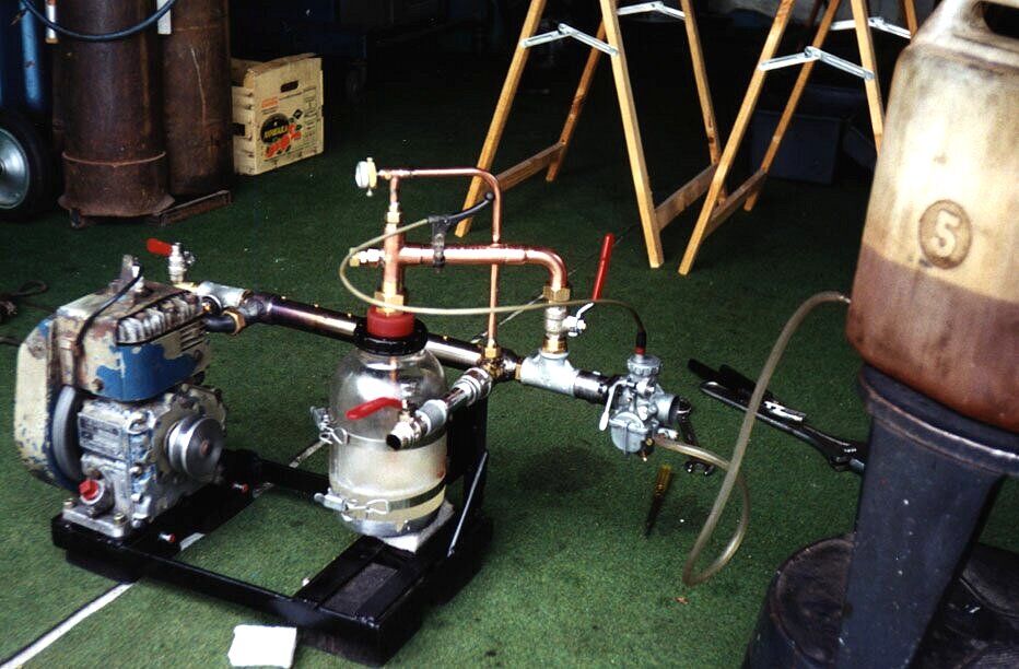 Photo d'une tondeuse à gazon et d'un banc d'essai avec moteur Bernard "rétrofitée" par Mr Linel (Toulouse) avec le Processeur Multi-Carburants de GEET. Des essais ont été réalisés avec des différentes tailles de réacteurs, des canons de différentes sortes (notamment hélicoïdaux), puis des variantes avec admission d'air réglable dans le bulleur et réchauffage. Des essais sont actuellement réalisés avec un carburateur mixte (gaz-oil/essence) et sont très prometteurs.