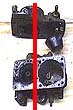 Cette photo montre le carbu ouvert en deux, nous l'avons coupé sur le trait rouge, et gardé la partie avec le flotteur. | ![]() |